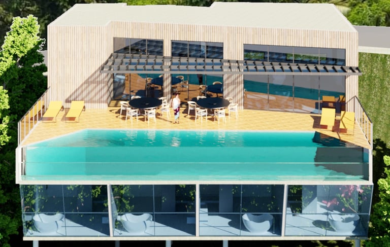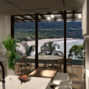 A arquitetura moderna deste lugar é perfeitamente integrada à natureza, proporcionando conforto e uma vista deslumbrante para a praia. Os espaços foram cuidadosamente projetados para se harmonizarem com o ambiente, utilizando materiais sustentáveis e tecnologias eco-friendly. As amplas janelas permitem uma abundância de luz natural e oferecem vistas panorâmicas do mar. Os quartos são espaçosos e aconchegantes, com decoração minimalista que valoriza a beleza natural ao redor. A varanda é o local perfeito para desfrutar de um café da manhã com vista para o mar ou relaxar ao pôr do sol. A proximidade com a natureza cria uma atmosfera serena e tranquila, proporcionando uma experiência única de integração com o meio ambiente.